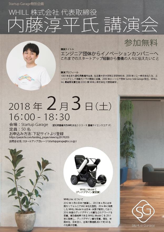 【2月3日】Startup Garage 特別企画 WHILL株式会社 代表取締役 内藤淳平氏 講演会開催のご案内